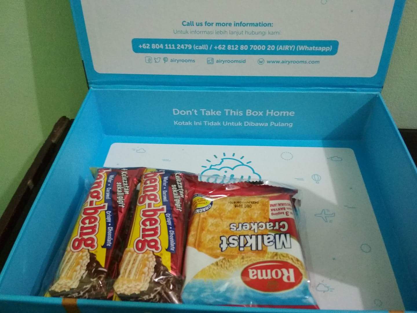 Setelah selesai menenangkan baby Azzam, sholat Maghrib akhirnya saya bisa lebih mengeksplorasi kamar yang akan saya tempati semalaman. Ada welcome snack & drink dari Airy, yang ini boxnya gak boleh dibawa pulang ya (padahal lucu banget). Lumayan lah buat kakak Hana yang hobi ngemil dapet malkist, better sama beng-beng masing-masing dua biji. Ada air mineral juga dua botol btw. Ini gratis ya boleh dihabiskan hehe.